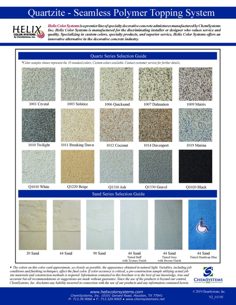 Selecting the right color is one of the most important steps in any decorative concrete project. Our wide range of color selection guides and color charts are available online or in hard copy at our Ft. Worth store. We are also happy to mail copies to any address nationwide. Whether you are seasoned professional, a designer or architect or a DIY homeowner, let the friendly and knowledgeable staff at Cement Colors help you pick the right color for your next project.